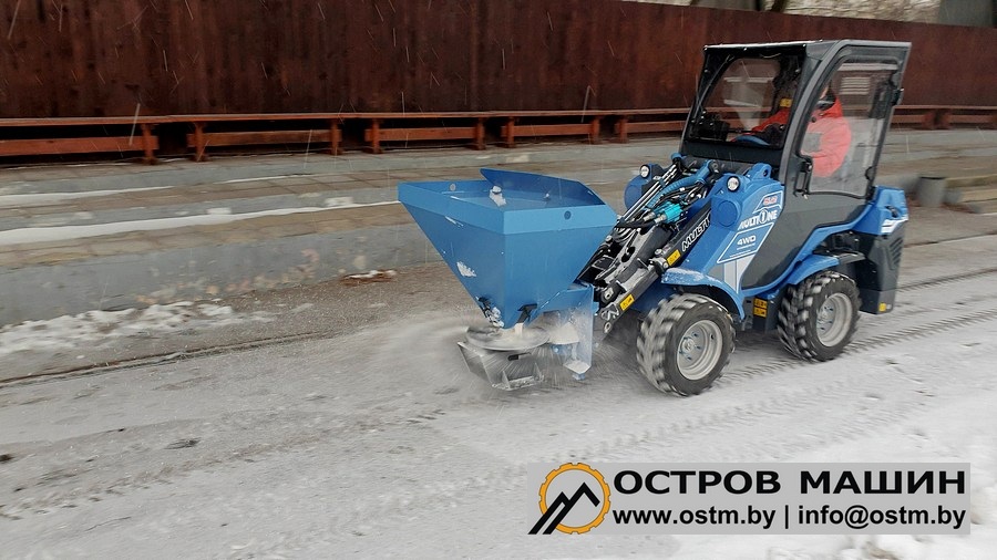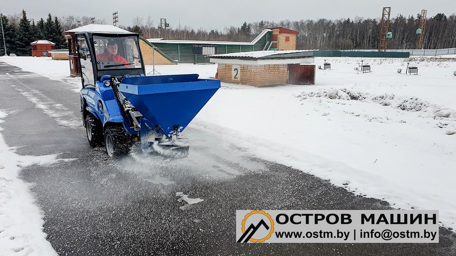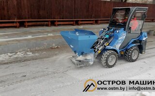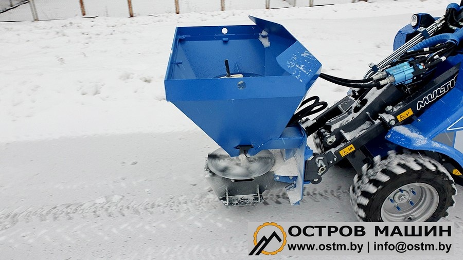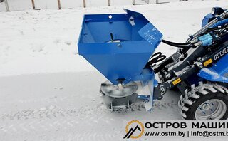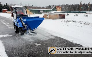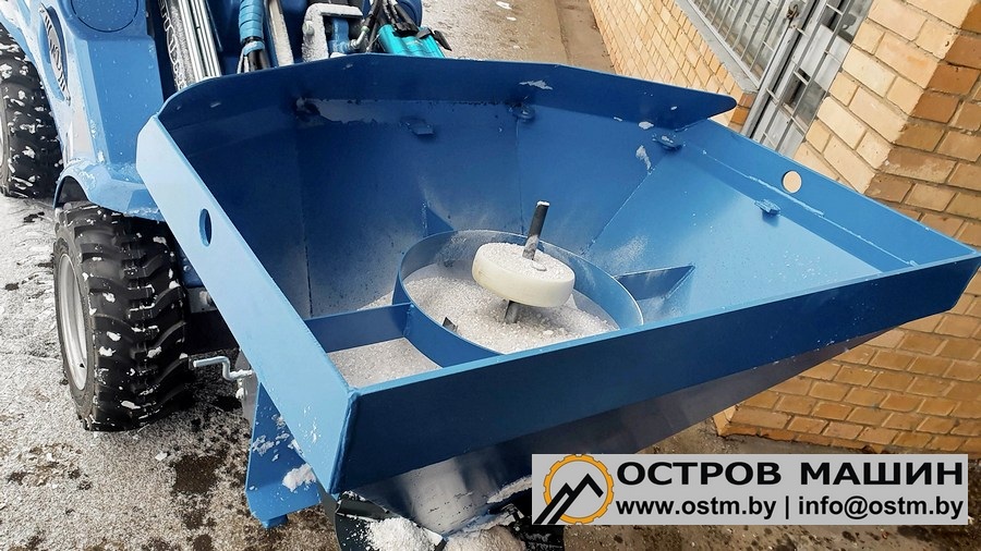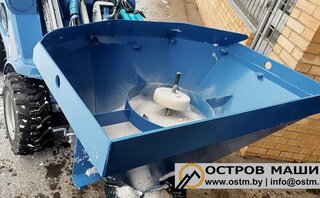 Пескоразбрасыватель - универсальное навесное оборудование, предназначенное для равномерного разбрасывания антигололедных материалов (реагентов). Высыпание антигололедных материалов дозируется с помощью шиберной заслонки, расположенной в нижней части бункера. Также в бункере установлены два ворошителя, которые мешают слёживанию и обеспечивают поточность процесса.
