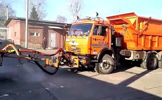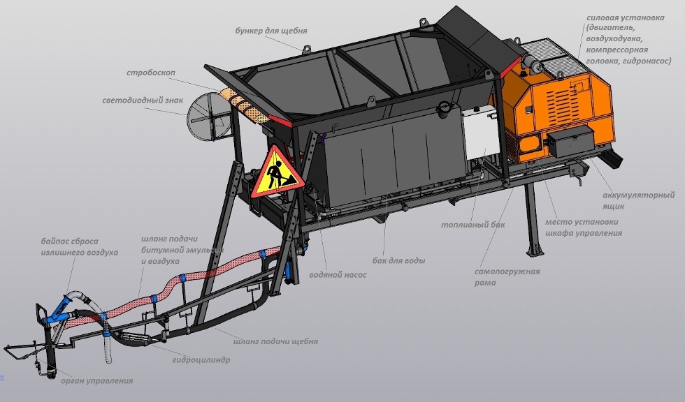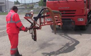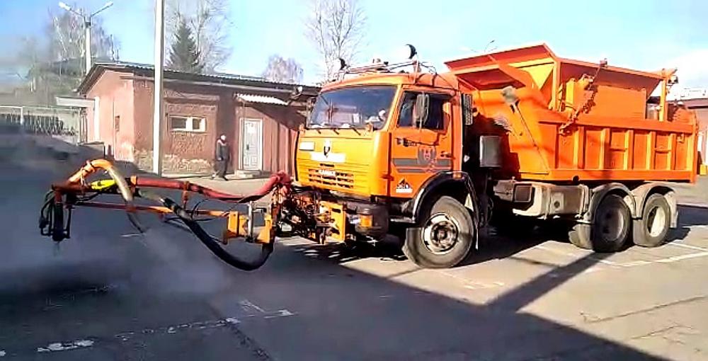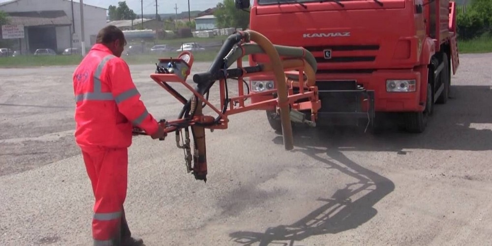 После очистки производится подгрунтовка места ремонта покрытия используемой битумной эмульсией, которая распыляется через форсунки, закрепленные на насадке рукава для транспортировки щебня. Битумная эмульсия подается по трубопроводам к форсункам с помощью компрессора, что обеспечивает хорошую транспортировку эмульсии, а также образование эмульсионной завесы в распылительном кольце, проходя через которую частицы щебня идеально обволакиваются.